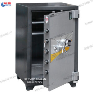+ Cách mở: Mở khóa chìa xoay hết theo chiều kim đồng hồ + Bấm mã điện tử + xoay tay nắm qua trái mở két.