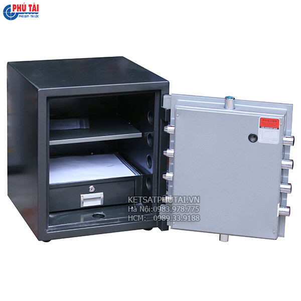 4, Điều tuyệt vời nhất là khả năng Chống cạy két, banh két tại chỗ: Thân vỏ 2 lớp dày 2ly (hoặc 10ly nếu đặt hàng) + ruột tổng hợp chất liệu chống cháy và chống cạy – đặc biệt Cánh cửa được làm từ thép Carbon dày 12ly theo tiêu chuẩn JIS Nhật Bản là loại thép có độ cứng rất cao cùng giàn chốt cơ 32ly ăn sâu thân két chống banh két cực kỳ hiệu quả.